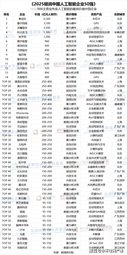 【全球网报道 记者 陈全】1月19日,胡润研究院正在京发布《2025胡润中国人工智能企业50强》(2025 Hurun China Artificial Intelligence Enterprises Top 50),上市公司市值按照2026年1月9日的收盘价计较,非上市公司估值参考同业业上市公司或者按照最新一轮融资环境进行估算。这是胡润研究院第二次发布该榜单。